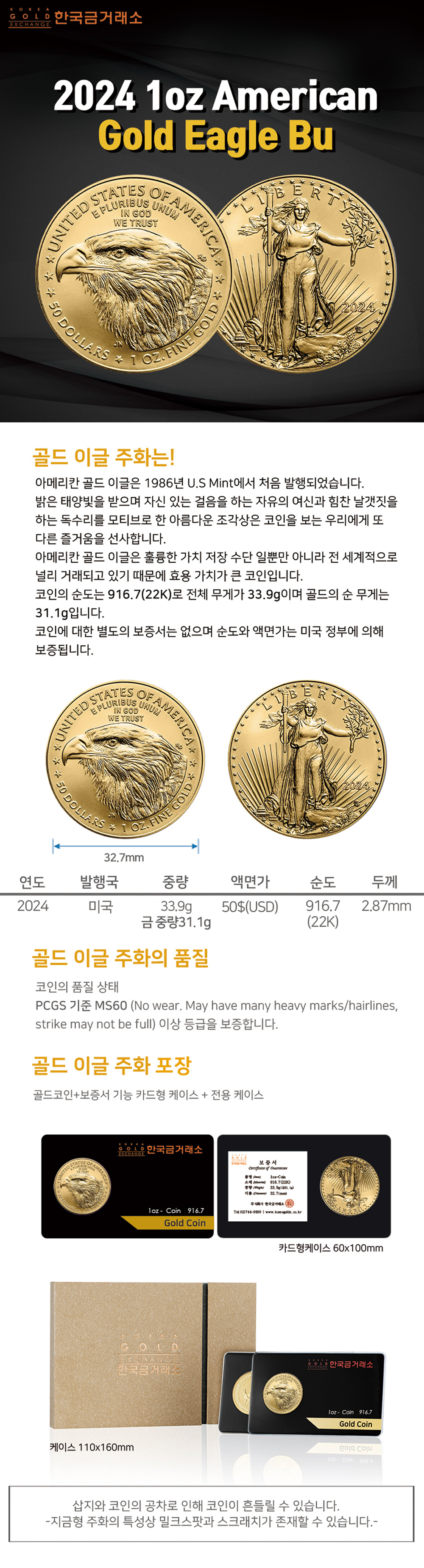 2024 1온스 아메리칸 골드 이글 불리온 주화(Coin) 50$(USD) - 22k